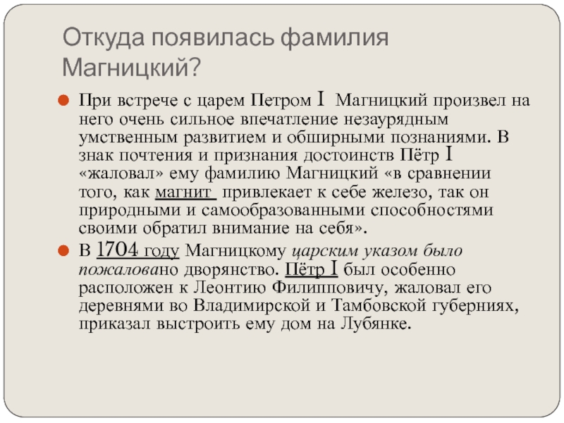 произвел на него очень сильное впечатление незаурядным умственным развитием и обширными познаниями. В знак почтения и признания достоинств Пётр I «жаловал» ему фамилию Магницкий «в сравнении того, как магнит привлекает к себе железо, так он природными и самообразованными способностями своими обратил внимание на себя».
