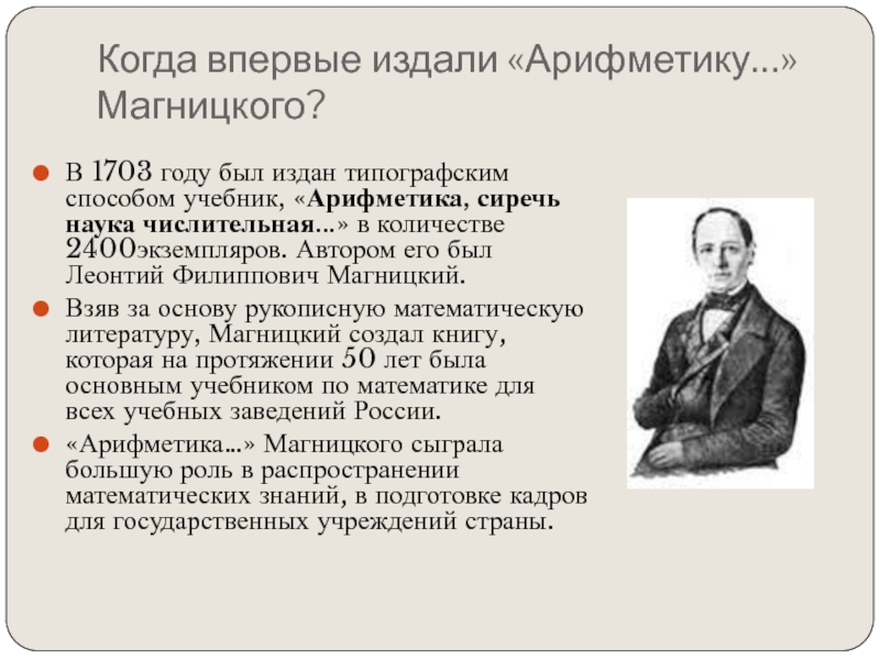 В 1703 году был издан типографским способом учебник, который назывался «Арифметика, сиречь наука числительная...». Автором его был выдающийся педагог-математик — Леонтий Филиппович Магницкий.