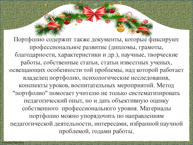 Слайд 23Портфолио содержит также документы, которые фиксируют профессиональное развитие (дипломы, грамоты, благодарности,