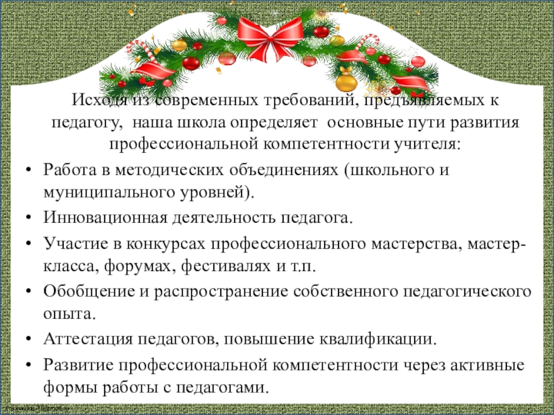 Слайд 10Исходя из современных требований, предъявляемых к педагогу, наша школа определяет основные