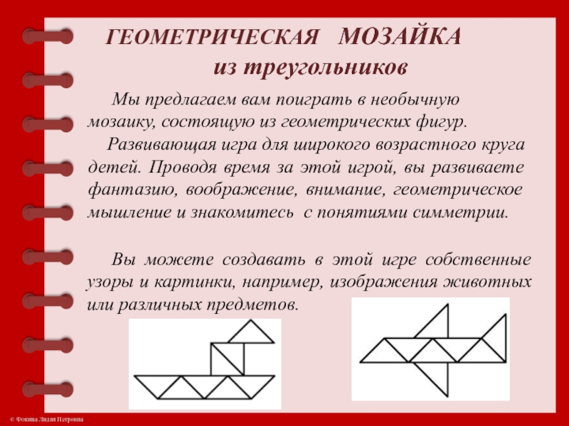 Развивающая игра для широкого возрастного круга детей. Проводя время за этой игрой, вы развиваете фантазию, воображение, внимание, геометрическое мышление и знакомитесь с понятиями симметрии.