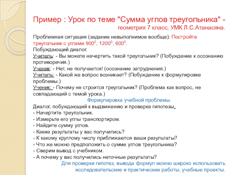 Пример : Урок по теме "Сумма углов треугольника" - геометрия 7 класс, УМК Л.С.Атанасяна.