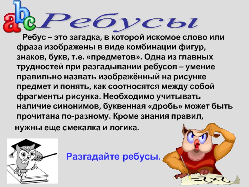 Ребус – это загадка, в которой искомое слово или фраза изображены в виде комбинации фигур, знаков, букв, т.е. «предметов». Одна из главных трудностей при разгадывании ребусов – умение правильно назвать изображённый на