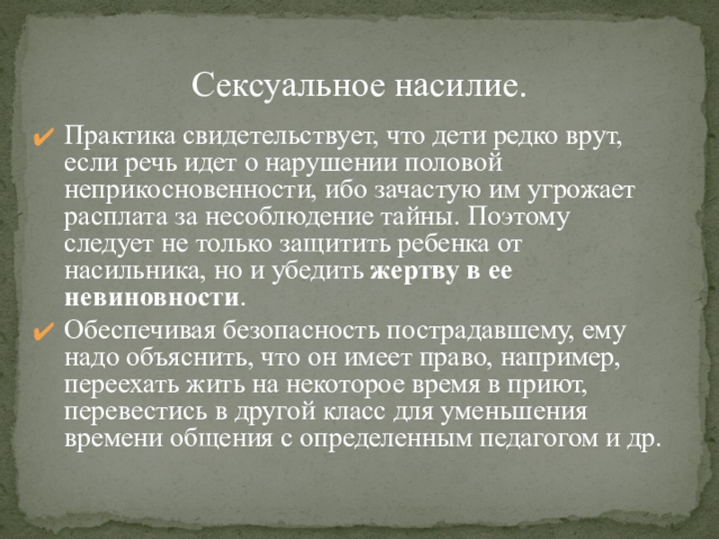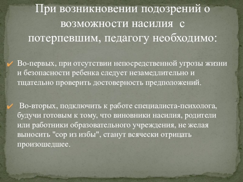 При возникновении подозрений о возможности насилия с потерпевшим, педагогу необходимо: