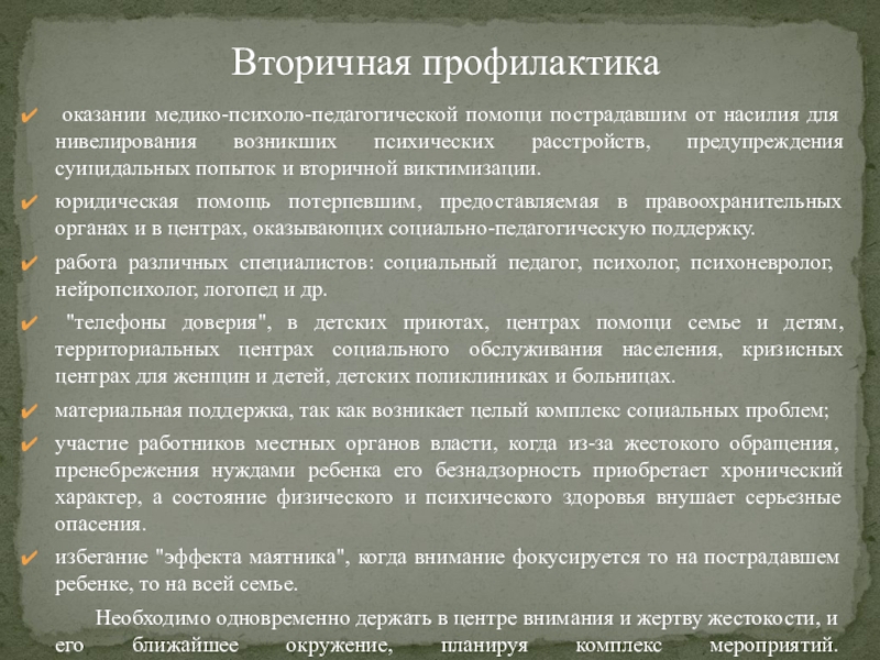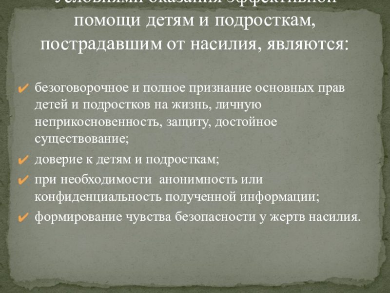 Условиями оказания эффективной помощи детям и подросткам, пострадавшим от насилия, являются: