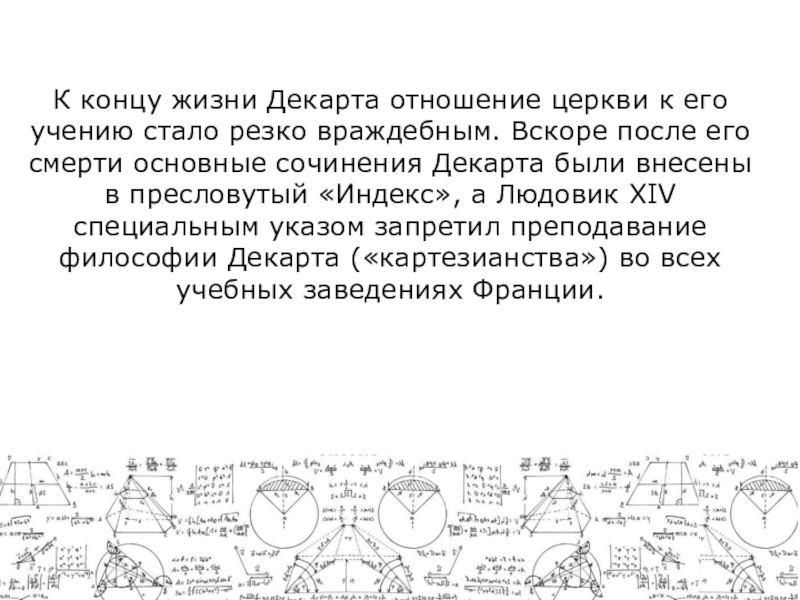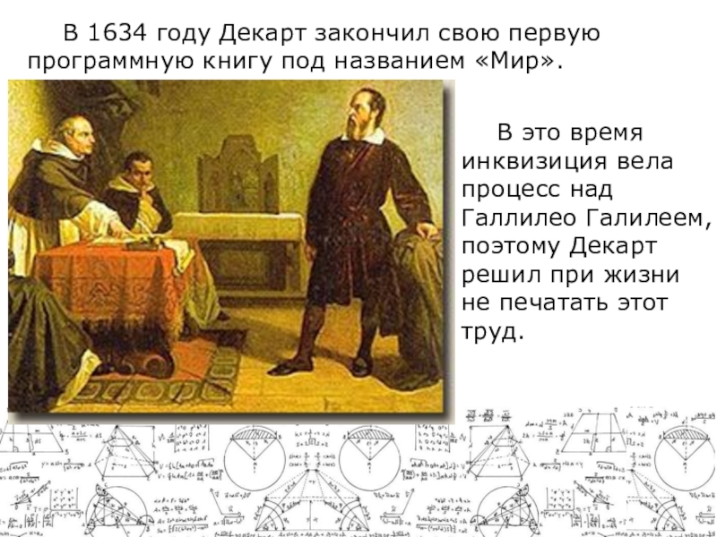 В это время инквизиция вела процесс над Галлилео Галилеем, поэтому Декарт решил при жизни не печатать этот труд.