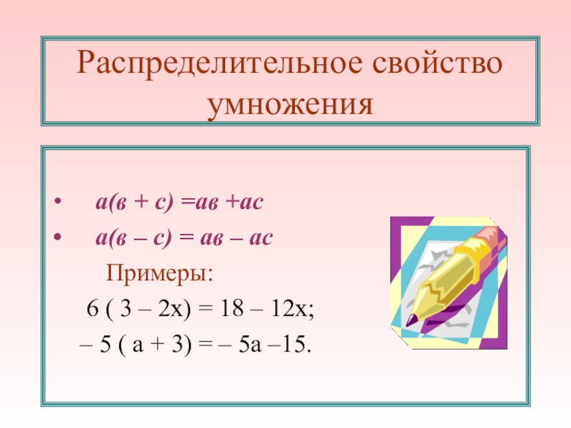 Распределительное свойство умножения  а(в + с) =ав +ас  а(в – с) = ав – ас