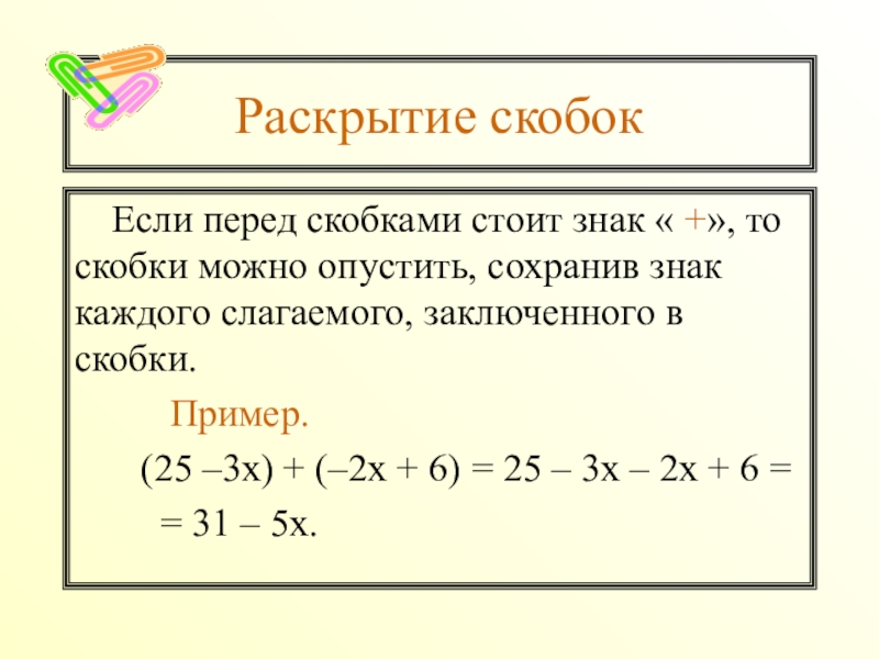 Раскрытие скобокЕсли перед скобками стоит знак « +», то скобки можно опустить, сохранив знак каждого слагаемого, заключенного
