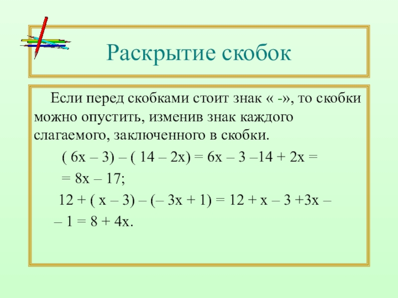 Раскрытие скобокЕсли перед скобками стоит знак « -», то скобки можно опустить, изменив знак каждого слагаемого, заключенного