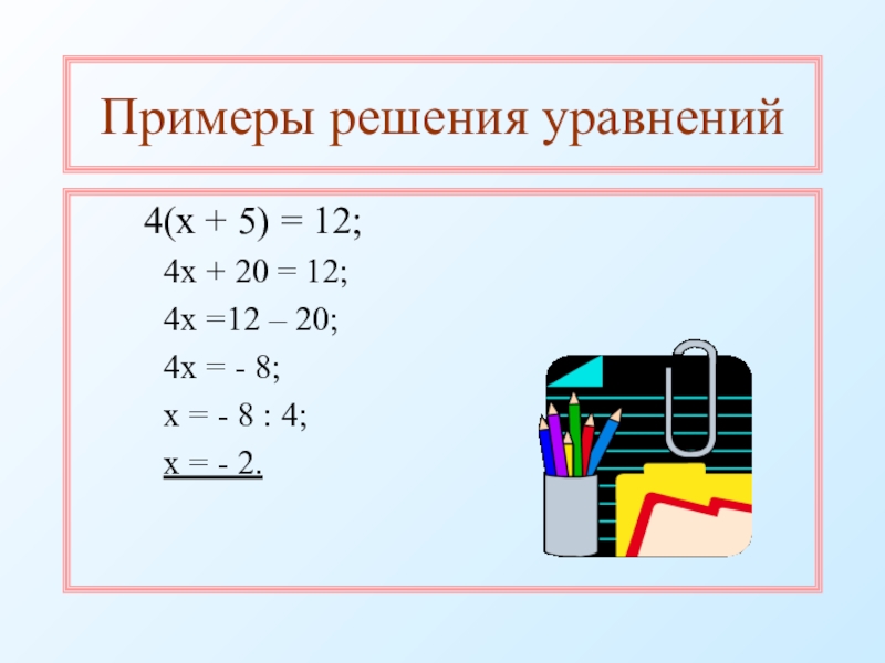 Примеры решения уравнений    4(х + 5) = 12;	4х + 20 = 12;	4х =12 –