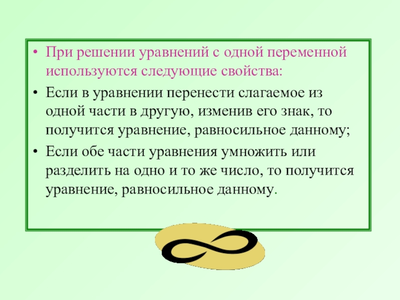 Слайд 4При решении уравнений с одной переменной используются следующие свойства: