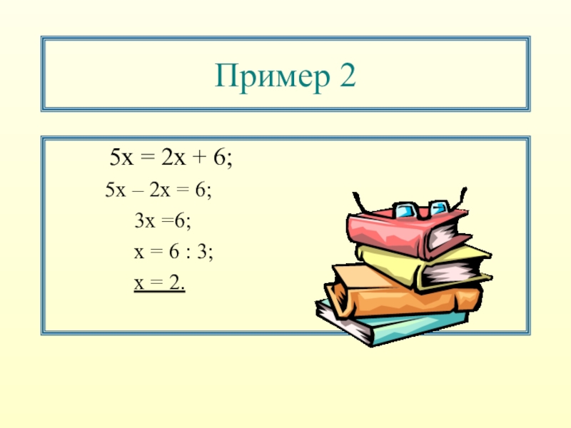 Пример 2	   5х = 2х + 6;   5х – 2х = 6;		3х =6;		х