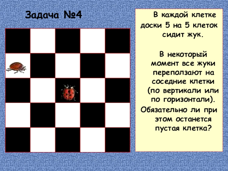 Задача №4   В каждой клетке доски 5 на 5 клеток сидит жук.