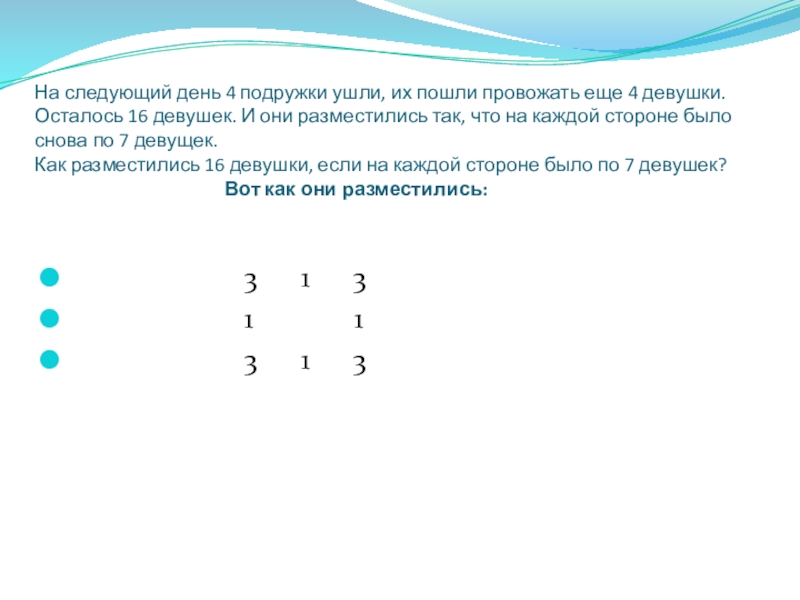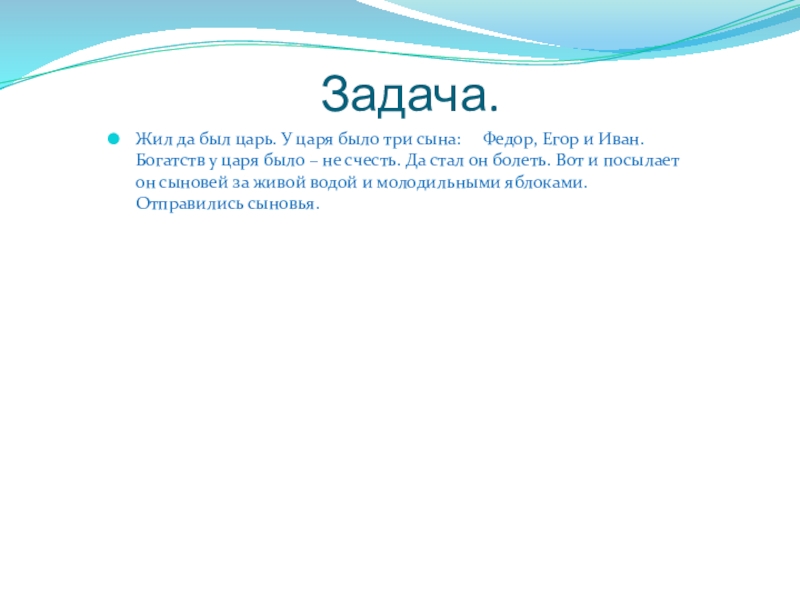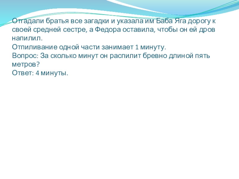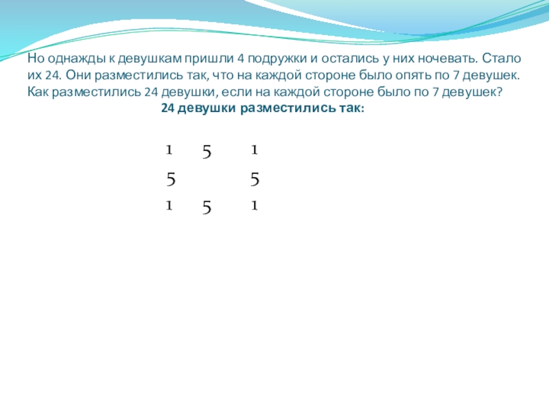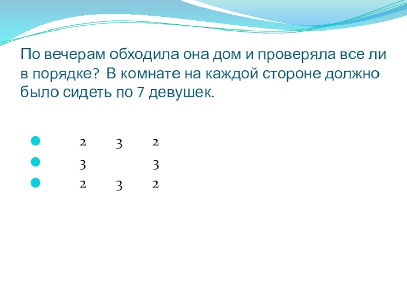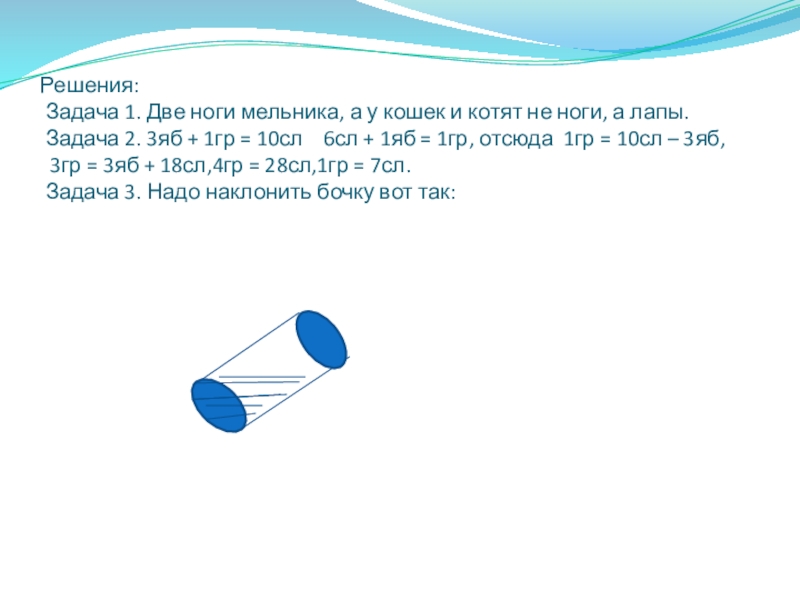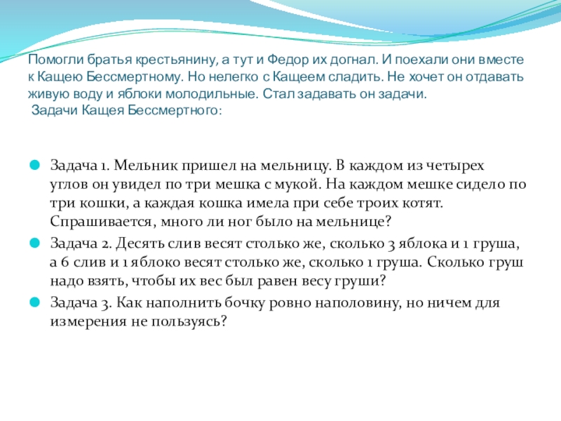 Задача 1. Мельник пришел на мельницу. В каждом из четырех углов он увидел по три мешка с мукой. На каждом мешке сидело по три кошки, а каждая кошка имела при себе троих котят. Спрашивается, много ли ног было на мельнице?