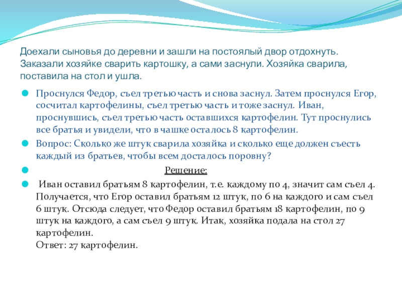 Иван оставил братьям 8 картофелин, т.е. каждому по 4, значит сам съел 4. Получается, что Егор оставил братьям 12 штук, по 6 на каждого и сам съел 6 штук. Отсюда следует, что Федор оставил братьям 18 картофелин, по 9 штук на каждого, а сам съел 9 штук. Итак, хозяйка подала на стол 27 картофелин. Ответ: 27 картофелин.