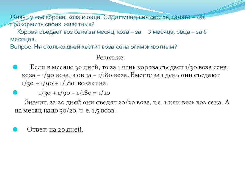 Значит, за 20 дней они съедят 20/20 воза, т.е. 1 или весь воз сена. А на месяц надо 30/20, т. е. 1,5 воза.