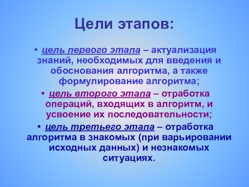 цель третьего этапа – отработка алгоритма в знакомых (при варьировании исходных данных) и незнакомых ситуациях.