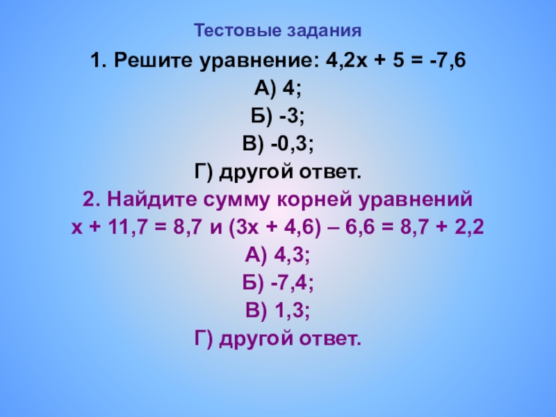 1. Решите уравнение: 4,2х + 5 = -7,6