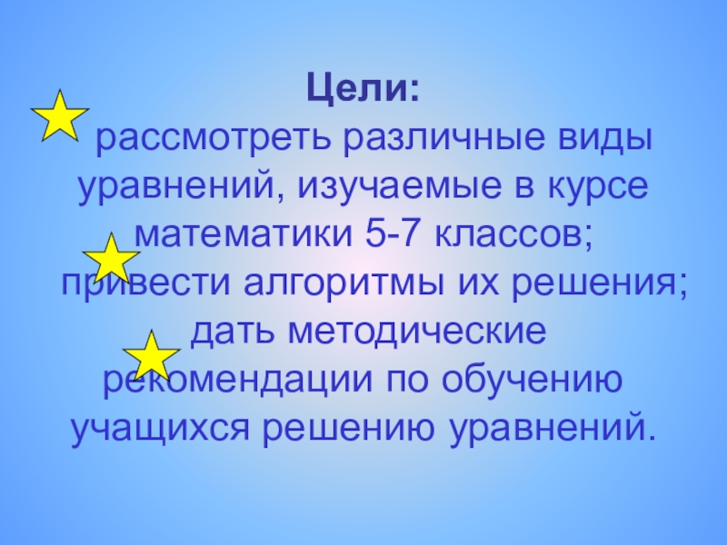 рассмотреть различные виды уравнений, изучаемые в курсе математики 5-7 классов;