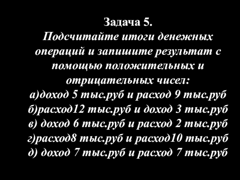 Задача 5.Подсчитайте итоги денежных операций и запишите результат с помощью положительных и отрицательных чисел:а)доход 5 тыс.руб и