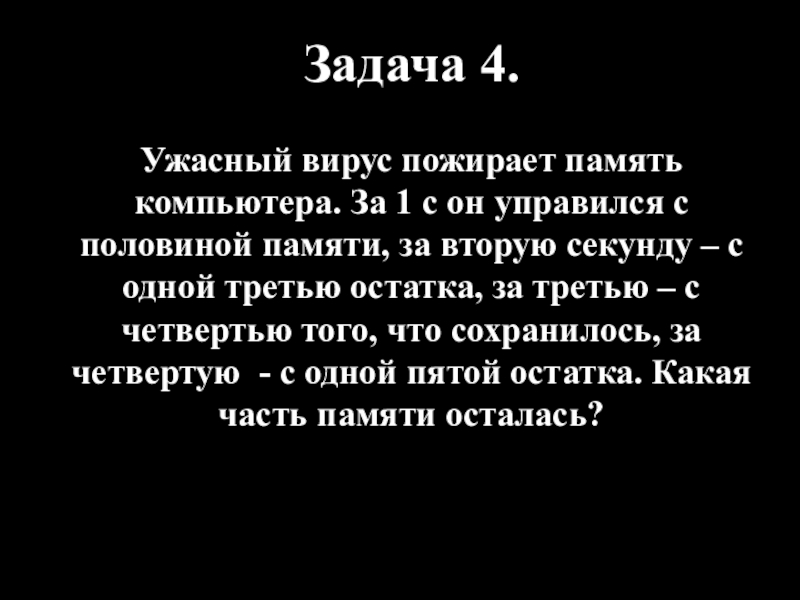Задача 4.Ужасный вирус пожирает память компьютера. За 1 с он управился с половиной памяти, за вторую секунду