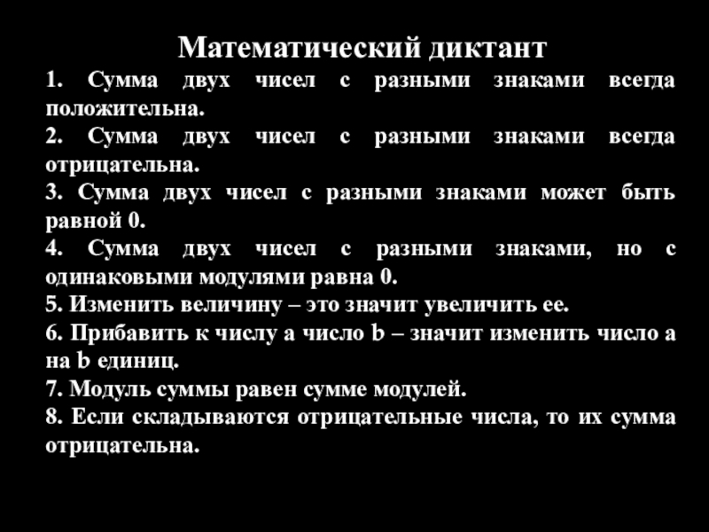Математический диктант1. Сумма двух чисел с разными знаками всегда положительна.2. Сумма двух чисел с разными знаками всегда