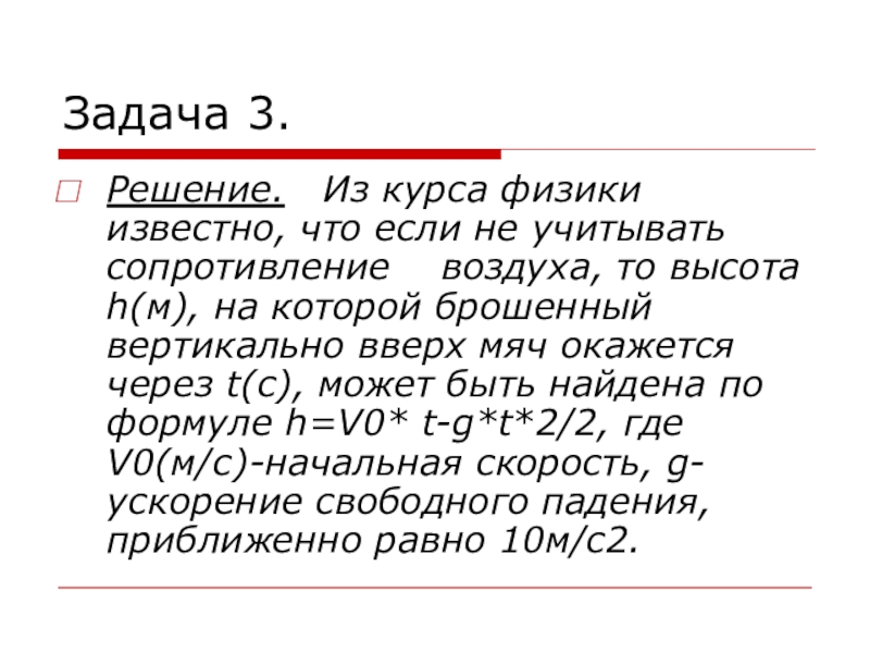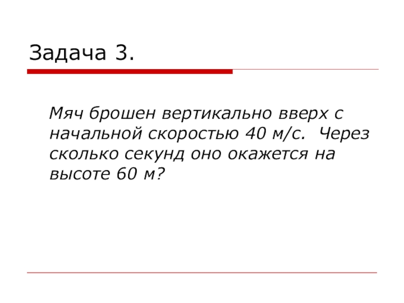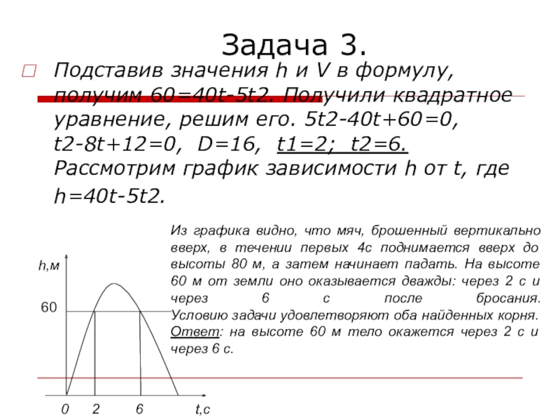 Из графика видно, что мяч, брошенный вертикально вверх, в течении первых 4с поднимается вверх до высоты 80 м, а затем начинает падать. На высоте 60 м от земли оно оказывается дважды: через 2 с и через 6 с после бросания. Условию задачи удовлетворяют оба найденных корня. Ответ: на высоте 60 м тело окажется через 2 с и через 6 с.