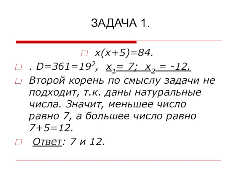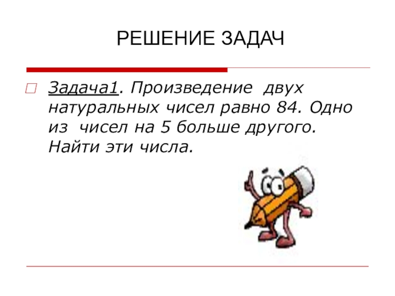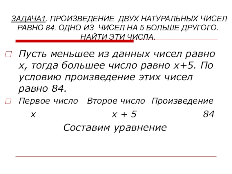 ЗАДАЧА1. ПРОИЗВЕДЕНИЕ ДВУХ НАТУРАЛЬНЫХ ЧИСЕЛ РАВНО 84. ОДНО ИЗ ЧИСЕЛ НА 5 БОЛЬШЕ ДРУГОГО. НАЙТИ ЭТИ ЧИСЛА.