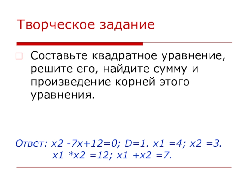 Ответ: x2 -7x+12=0; D=1. x1 =4; x2 =3.