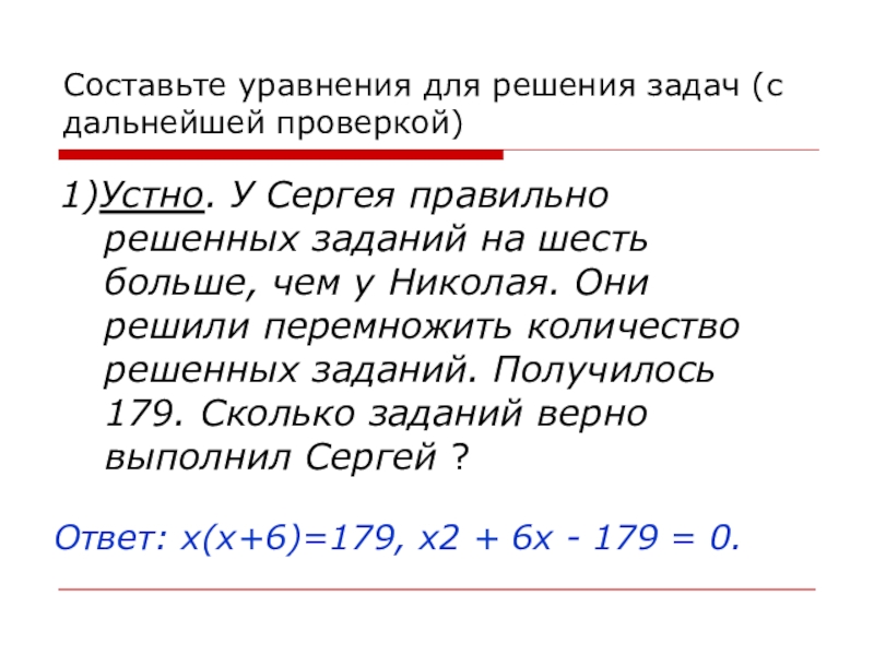 Ответ: х(х+6)=179, х2 + 6х - 179 = 0.