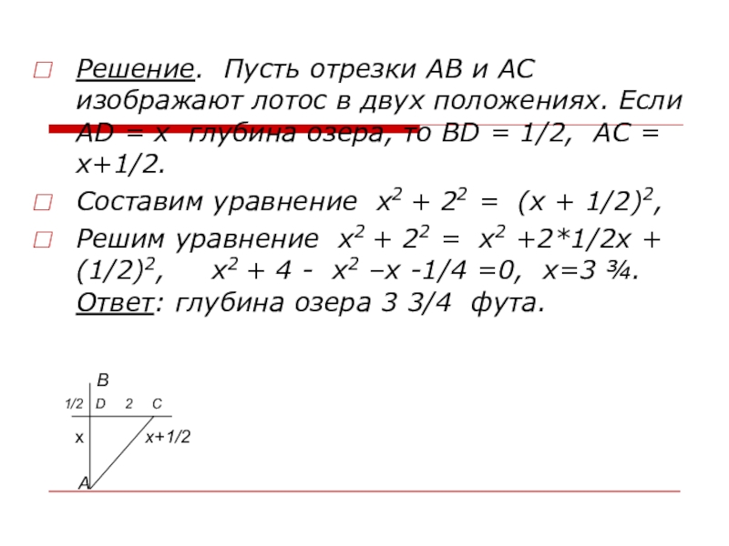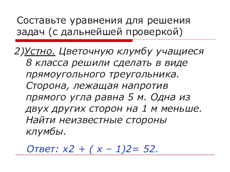 Ответ: х2 + ( х – 1)2= 52.