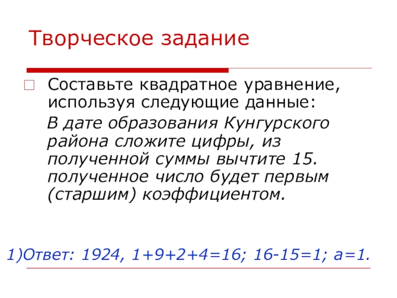 Ответ: 1924, 1+9+2+4=16; 16-15=1; а=1.