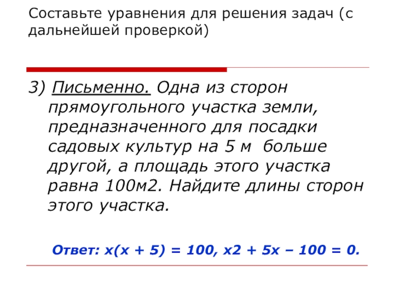 Ответ: х(х + 5) = 100, х2 + 5х – 100 = 0.