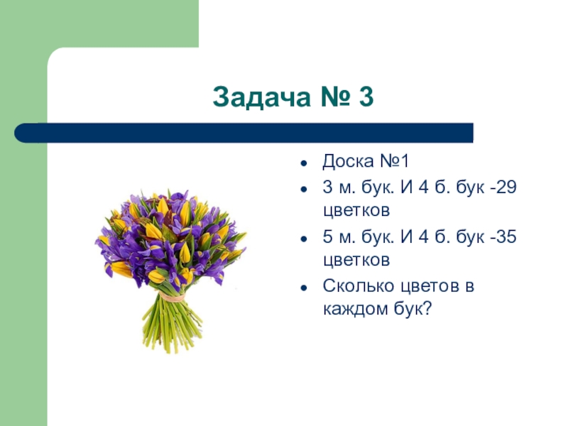 Задача № 3Доска №13 м. бук. И 4 б. бук -29 цветков5 м. бук. И 4 б.