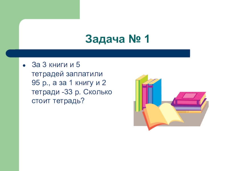Задача № 1За 3 книги и 5 тетрадей заплатили 95 р., а за 1 книгу и 2