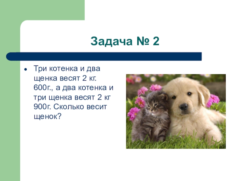 Задача № 2Три котенка и два щенка весят 2 кг. 600г., а два котенка и три щенка