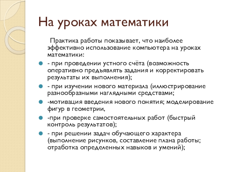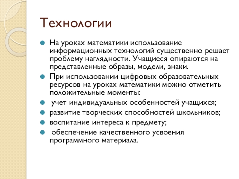 При использовании цифровых образовательных ресурсов на уроках математики можно отметить положительные моменты: