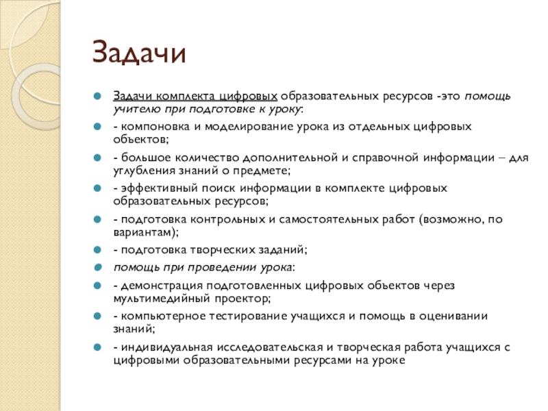 Задачи комплекта цифровых образовательных ресурсов -это помощь учителю при подготовке к
