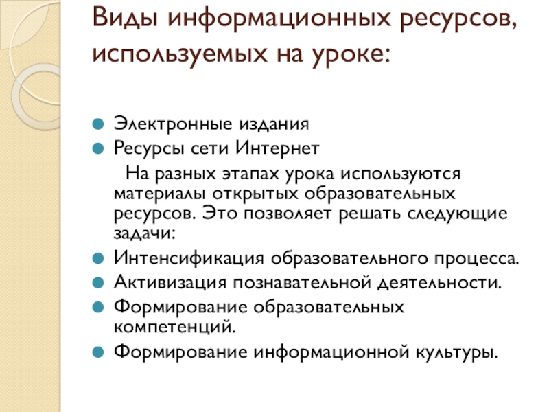 Слайд 12Виды информационных ресурсов, используемых на уроке: