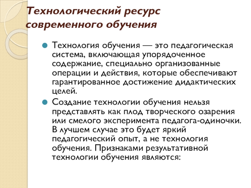 Создание технологии обучения нельзя представлять как плод творческого озарения или смелого эксперимента педагога-одиночки. В лучшем случае это будет яркий педагогический опыт, а не технология обучения. Признаками результативной технологии обучения являются: