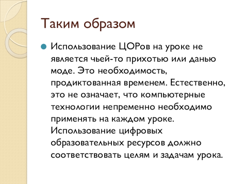 моде. Это необходимость, продиктованная временем. Естественно, это не означает, что компьютерные технологии непременно необходимо применять на каждом уроке. Использование цифровых образовательных ресурсов должно соответствовать целям и задачам урока.