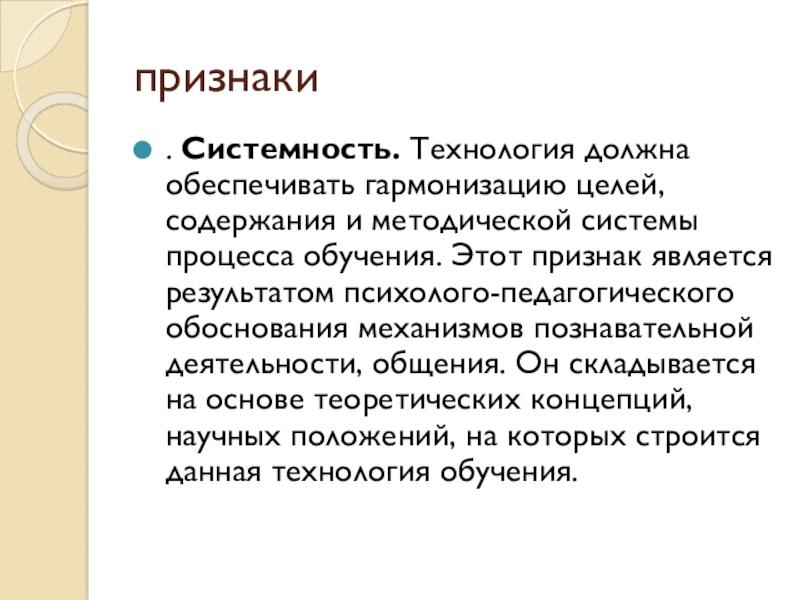 Этот признак является результатом психолого-педагогического обоснования механизмов познавательной деятельности, общения. Он складывается на основе теоретических концепций, научных положений, на которых строится данная технология обучения.