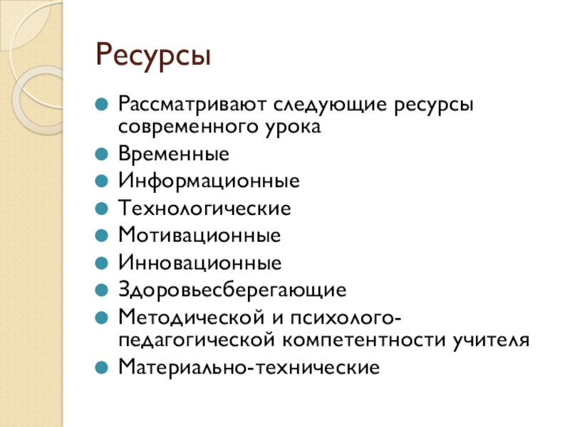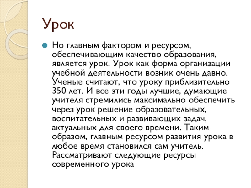 как форма организации учебной деятельности возник очень давно. Ученые считают, что уроку приблизительно 350 лет. И все эти годы лучшие, думающие учителя стремились максимально обеспечить через урок решение образовательных, воспитательных и развивающих задач, актуальных для своего времени. Таким образом, главным ресурсом развития урока в любое время становился сам учитель. Рассматривают следующие ресурсы современного урока