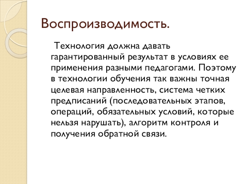 разными педагогами. Поэтому в технологии обучения так важны точная целевая направленность, система четких предписаний (последовательных этапов, операций, обязательных условий, которые нельзя нарушать), алгоритм контроля и получения обратной связи.