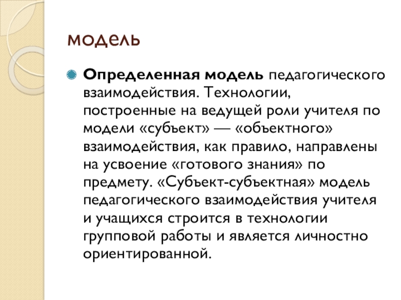 «субъект» — «объектного» взаимодействия, как правило, направлены на усвоение «готового знания» по предмету. «Субъект-субъектная» модель педагогического взаимодействия учителя и учащихся строится в технологии групповой работы и является личностно ориентированной.