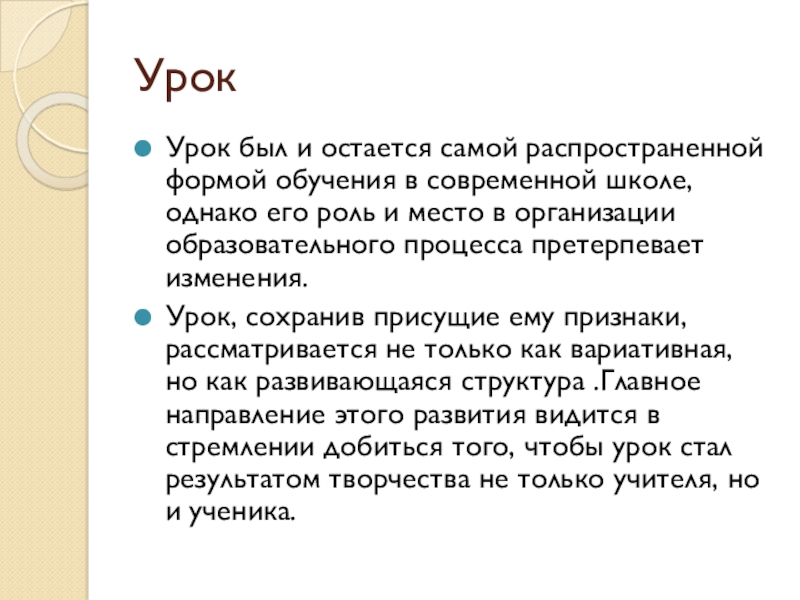 Урок, сохранив присущие ему признаки, рассматривается не только как вариативная, но как развивающаяся структура .Главное направление этого развития видится в стремлении добиться того, чтобы урок стал результатом творчества не только учителя, но и ученика.