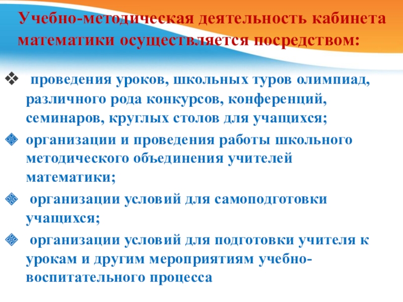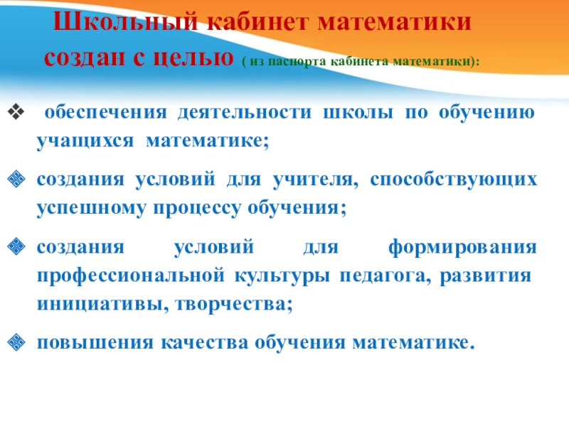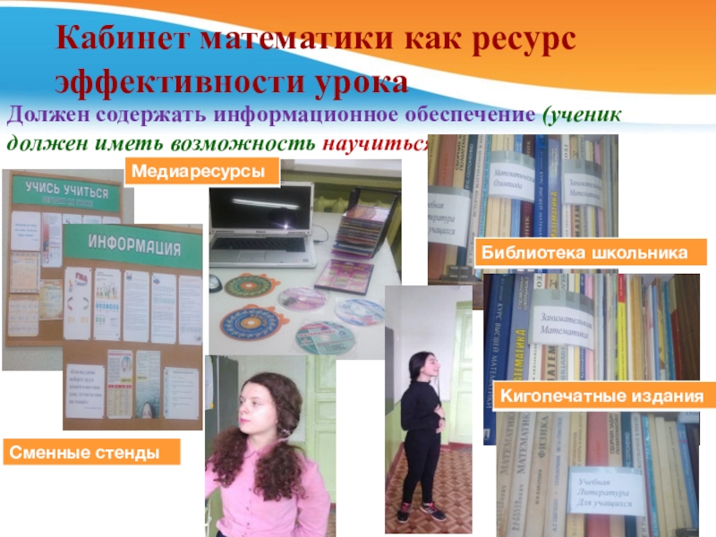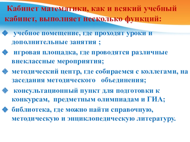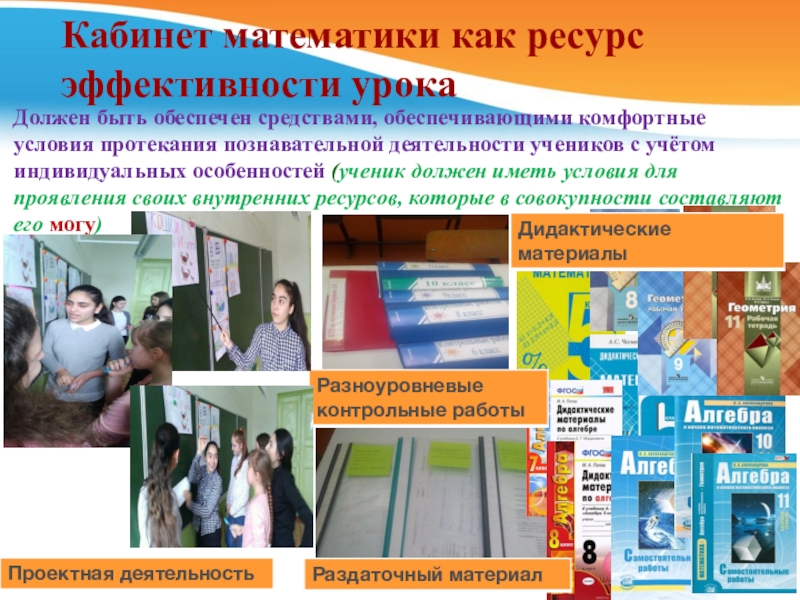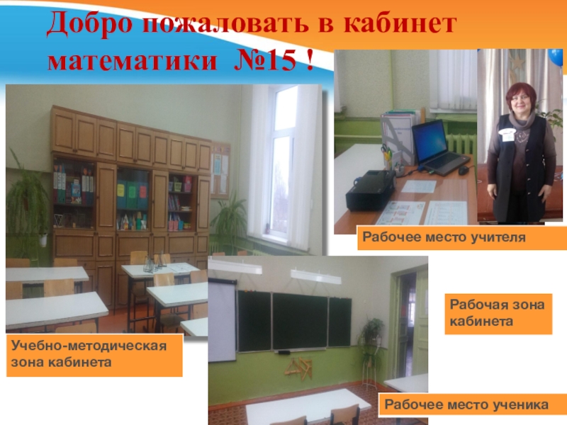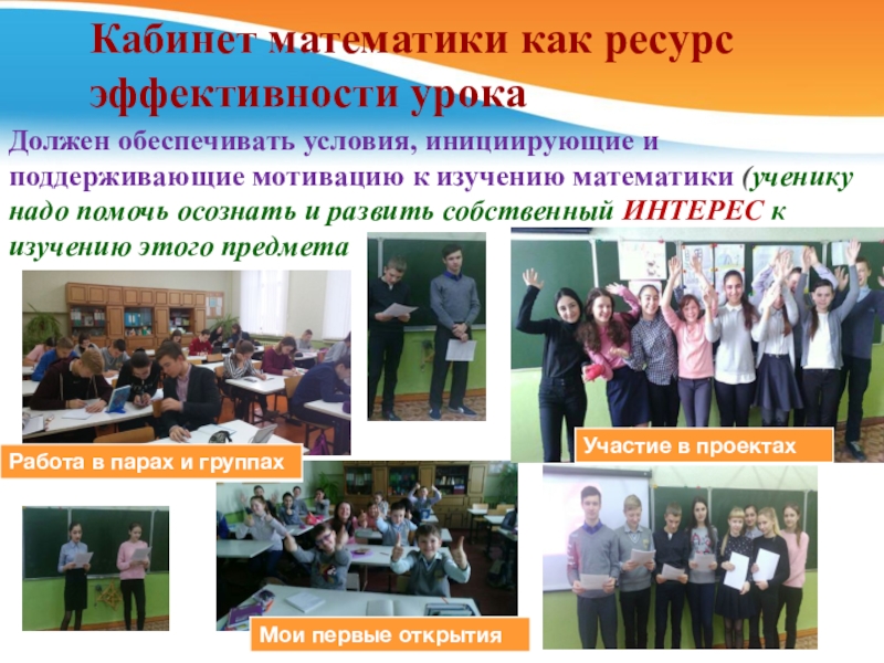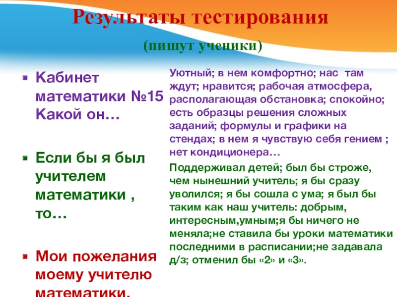 Уютный; в нем комфортно; нас там ждут; нравится; рабочая атмосфера, располагающая обстановка; спокойно; есть образцы решения сложных заданий; формулы и графики на стендах; в нем я чувствую себя гением ;нет кондиционера…