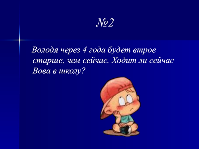 №2  Володя через 4 года будет втрое старше, чем сейчас. Ходит ли сейчас Вова в школу?