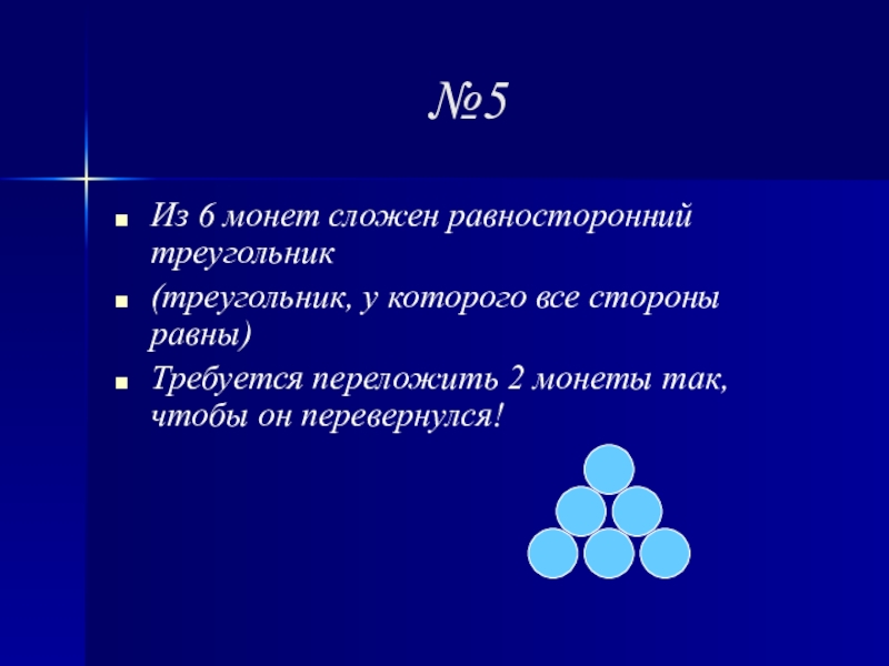 №5Из 6 монет сложен равносторонний треугольник (треугольник, у которого все стороны равны)Требуется переложить 2 монеты так, чтобы