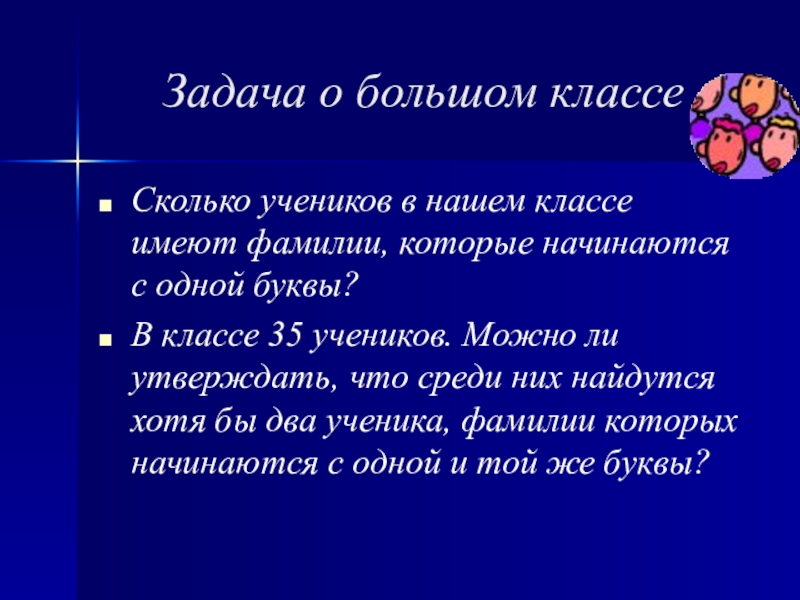 Задача о большом классеСколько учеников в нашем классе имеют фамилии, которые начинаются с одной буквы?В классе 35